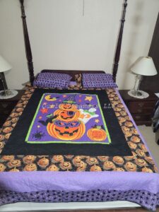 This super cute queen sized Halloween quilt features a haunted castle with jack o’lanterns pumpkins and bats!